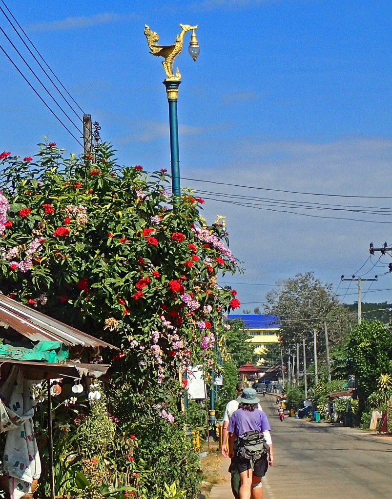 Sangkhlaburi isn’t particularly impressive, but as is often the case in small Thai towns beauty is bursting at the seams. Where else would a shack be embowered with flowers and a street light be carried by a golden Griffin?