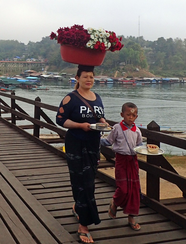 Just across the bridge in the Mon village elegant women in sarongs carry baskets of flowers on their heads.