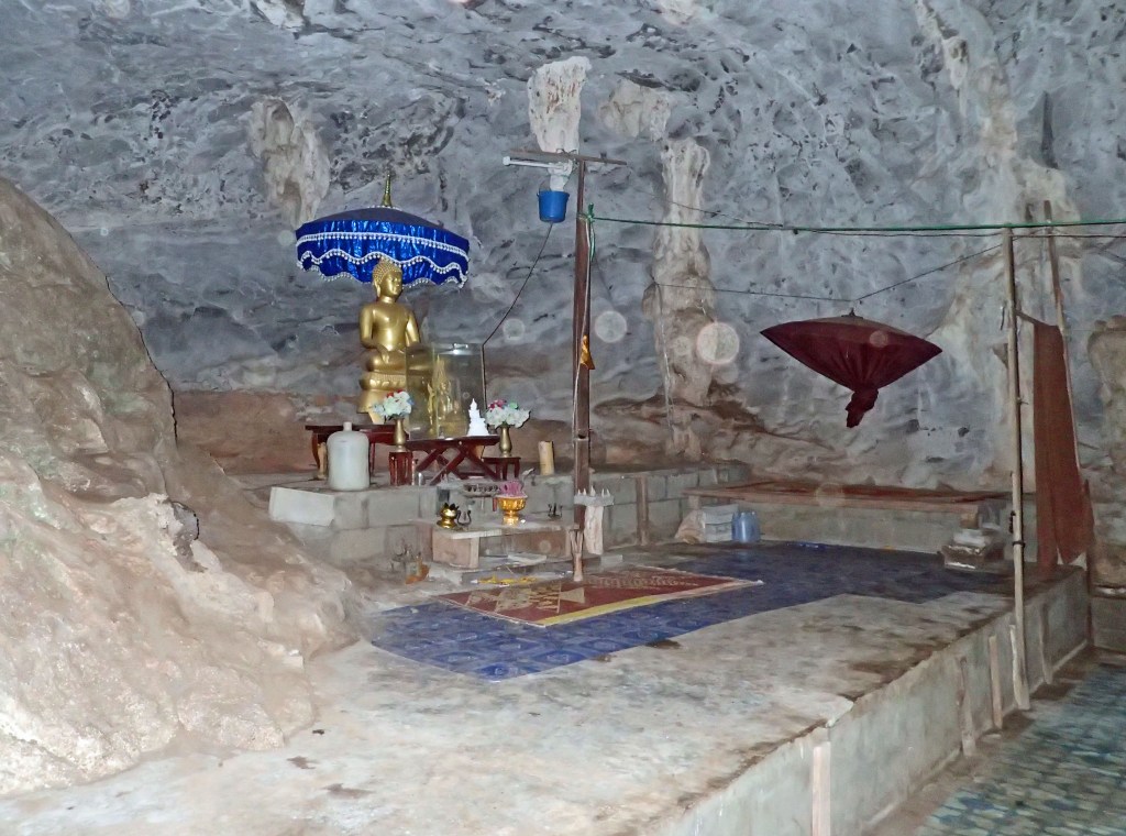 There wasn’t much else to do so we wandered out of town. After a lengthy trek through the countryside we noticed an isolated karst mountain and there discovered the Tham Kaeo Sawan Badan meditation center.