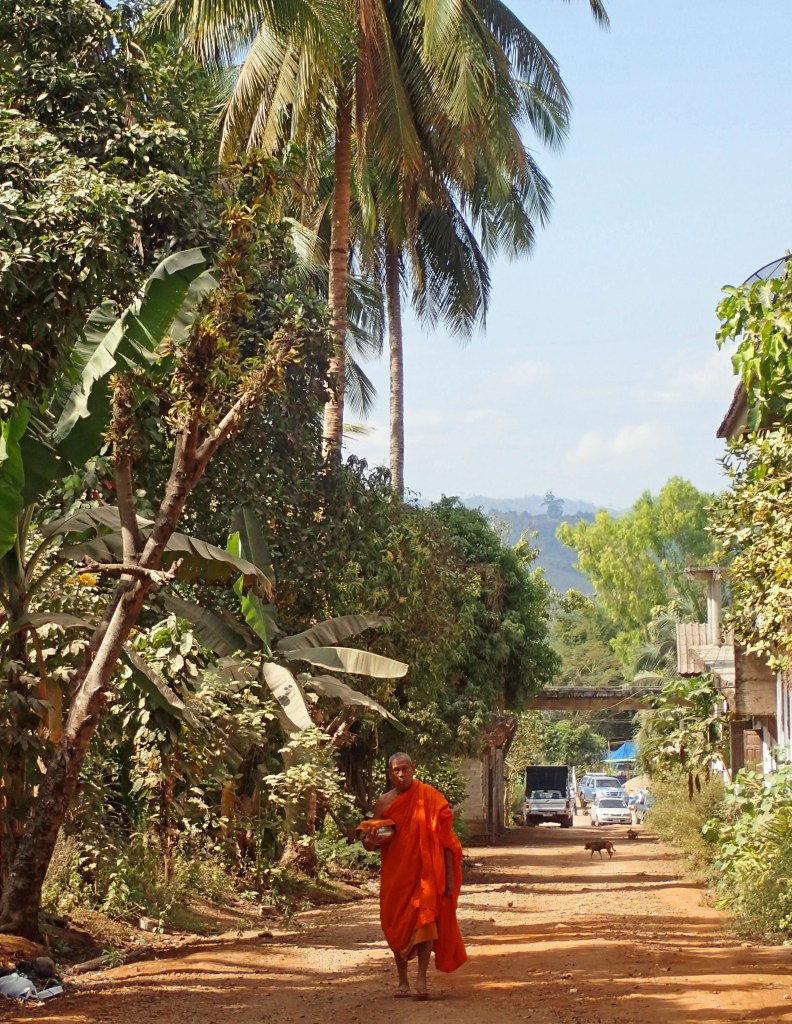 Notice that the Monk is carrying a bowl. The faithful are expected to put rice in the bowl and a morsel in the dog’s mouth. Foreigners are exempt, because everyone knows they come from corrupt cultures where greed is God. A good Buddhist can only pity those who know nothing of kindness and generosity.