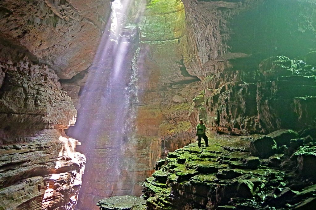 The gorge of Cane creek is approximately 1000 feet deep. Though the area has been inhabited for hundreds of years, and numerous explorers and scientists have carefully combed the forested slopes, we know from hydrological data that numerous huge caves await discovery.