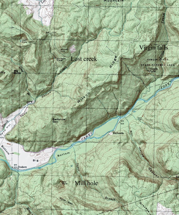 Could there be other such wonders hidden in the wild gorge of the Caney fork river? I have long been fascinated by the Mill hole, an enormous sink clearly visible on a topo map that lies across the river due south of Lost creek. I imagined it to be just like Lost creek only better, I even had plans to buy the place if I could, but every time I visited the Caney fork the waters were too high for me to cross.