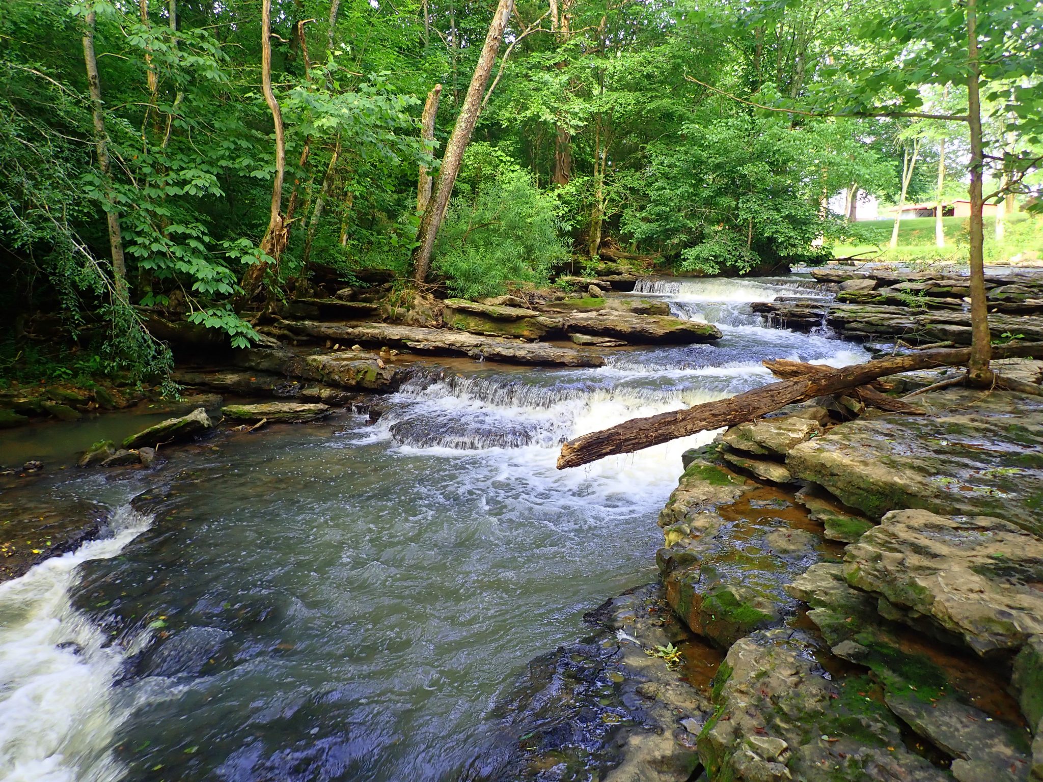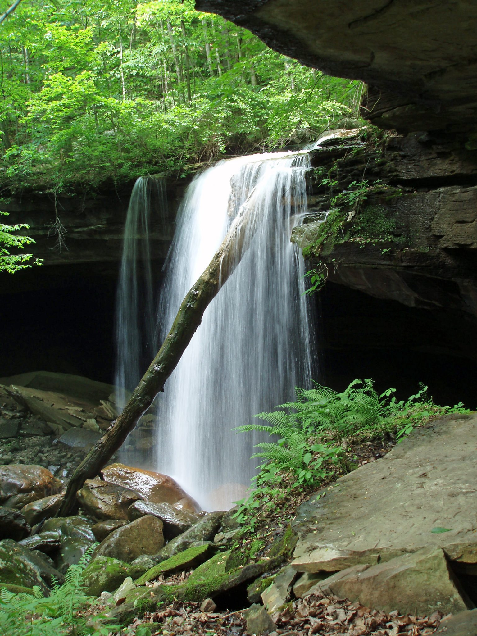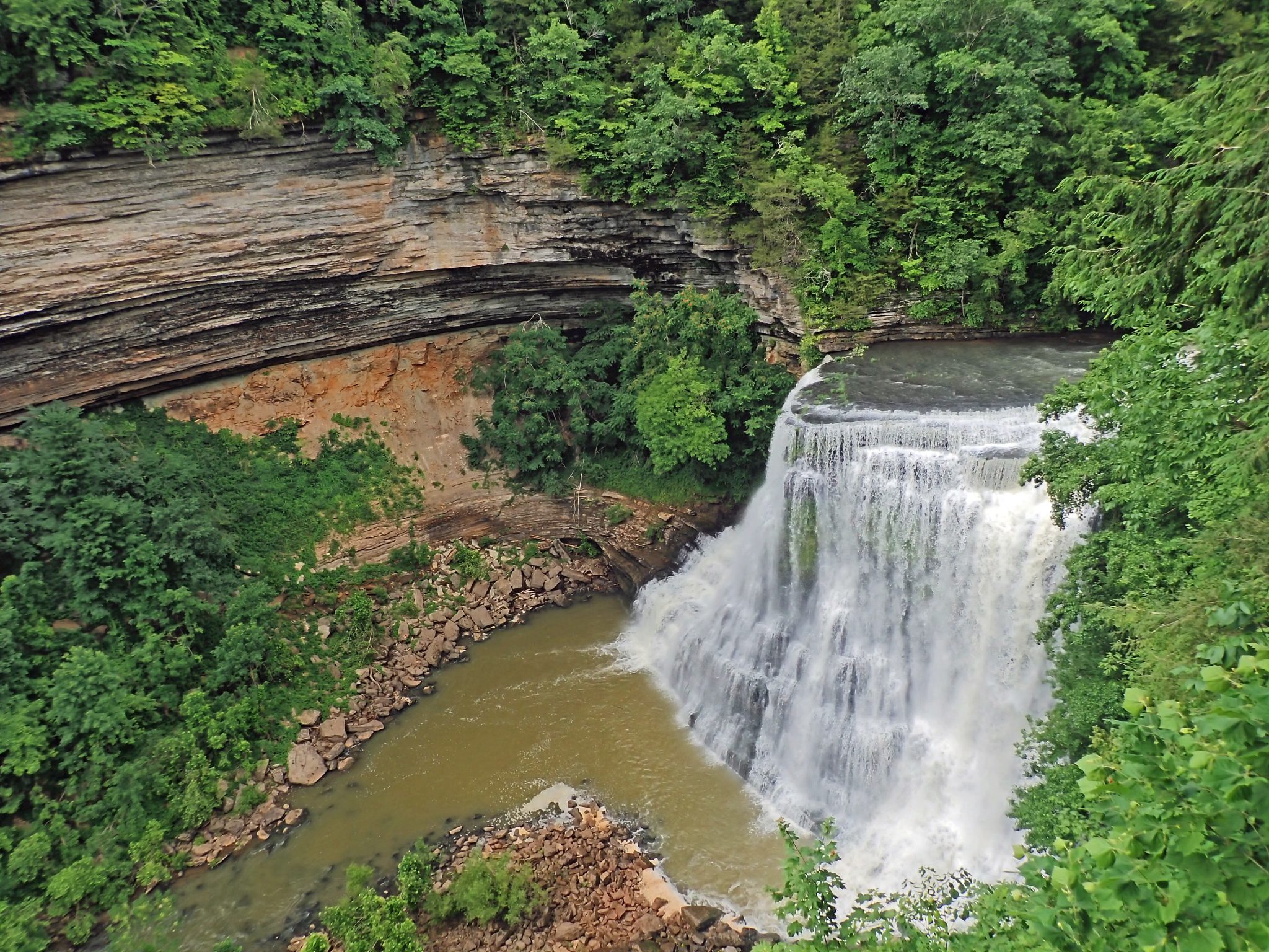 It may seem a strange to see water pour out of one cave, thunder over a waterfall, then disappear into another cave with no stream in between, but that is typical of this part of the Cumberland plateau wherever soluble limestone strata are interrupted by an impervious layer.