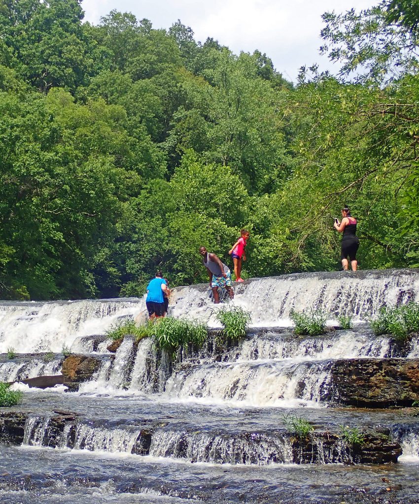 The ladders and walkway to the bottom has been closed for safety reasons, but above the main falls there are safer places for people to play.