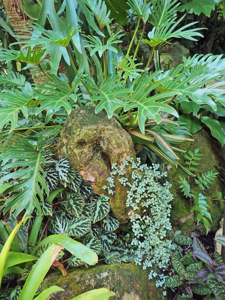 Bromeliads and other lithophytic plants adorn a large boulder at the Butterfly Rainforest