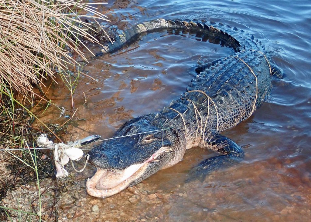 The poor beast seen above is wrapped in at least five different fishing and crabbing lines. There is a wad of rotten meat and fishing lures in front of its nose, and another lodged in its throat. Who knows what is in its stomach?Despite the fact that the animal had a zero chance of survival, I tried to rescue it, not an easy thing to do with an angry alligator!