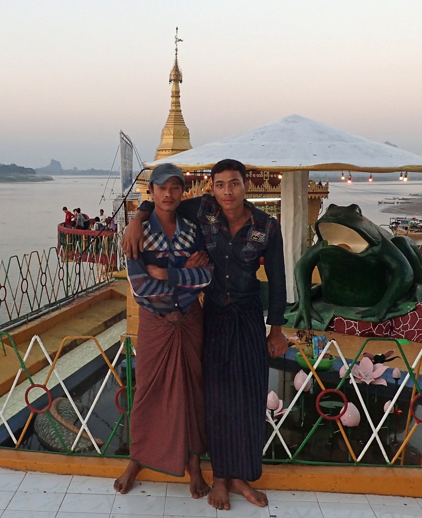 Don’t jump to any conclusions. Just because these fellows are wearing skirts and hugging doesn’t mean that this sacred place is the moral equivalent of the men’s room at the Washington monument. In Burma many traditional men wear skirts, also known as “sarongs”, and in sexually repressive societies men often hug each other when farm animals are not available. The frog, having achieved Nirvana, was oblivious to all this.