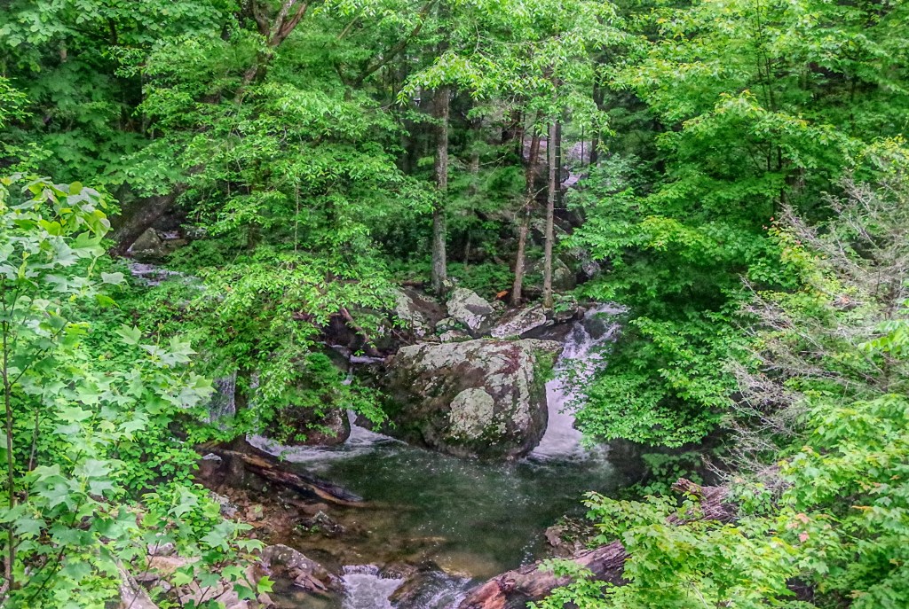 Below Cherokee falls Daniel creek tumbles through rich forest before plunging over Hemlock falls.