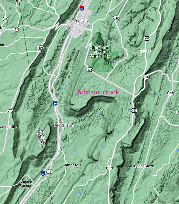 As you can see below, Johnson’s crook is immediately east of the euphoniously named Rising Fawn, GA. The crook is a major indentation on the western flank of Lookout mountain not far from the Alabama/Georgia state line. It is immediately south of magnificent Cloudland canyon (more on that later).
