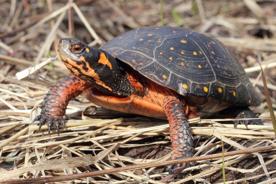 The elfin creature was blackish with bright orange cheeks. It appeared to be ancient even though it was less than four inches long. I immediately presumed it to be a Spotted turtle Clemmys guttata, the first I had seen in many years.