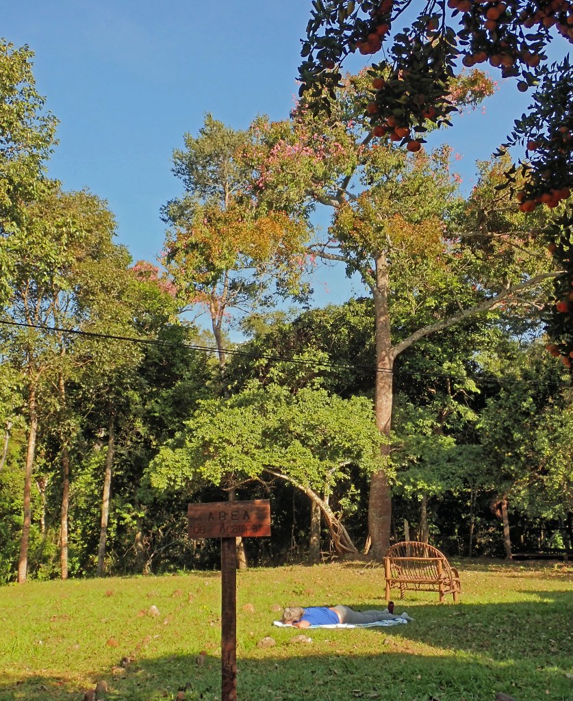 Behind my prostrate sweetie you see a big toborochi tree (Ceiba speciosa) with pink blossoms. Birds of many species, including brilliant toucans and macaws, would come to tear apart the blossoms and nibble the citrus pulp left behind by the cattle. There were even friendly capuchin monkeys! Without binoculars, and a telephoto lens for my point and shoot camera, it was difficult to fully appreciate, much less record, the arboreal spectacle that happened every morning.