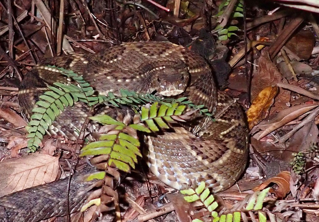 The cascabel has the largest distribution of any pit viper. Their range is discontinuous, but various subspecies may be found from northern Mexico all the way to central Argentina. Like the diamondback, they prefer open dry terrain, so I hardly expected to discover one at the edge of the jungle. I had hoped to find one on our trip, just not between my legs!