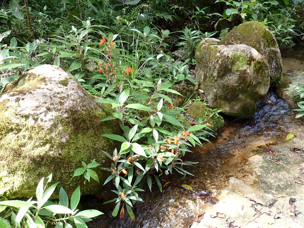 I have a special interest in Gesneriads, a family of tropical herbaceous plants with beautiful blossoms. So it was that I was delighted to see that the edge of the stream was lined by lovely Gloxinias with bright orange blossoms.