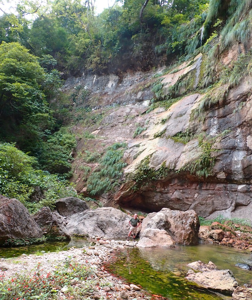 I was puzzled by the presence of travertine, though it was of low quality and barely worthy of the name. I am fascinated by travertine because it is the only kind of rock, other than cave formations, that actually grows. Everything else erodes. Travertine is often deposited by hot springs rich in calcium carbonate, but I saw no sign of that here. The surrounding mountains were composed of limey sandstone, so I suppose that calcium rich water simply oozes out of the ground. That alone would not be sufficient to create travertine, but in tropical areas autotrophic cyanobacteria deposit travertine as a metabolic byproduct, so it can be said that travertine is alive!