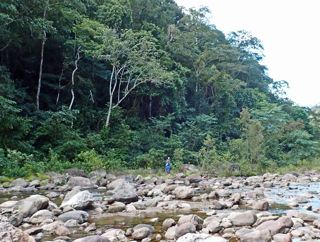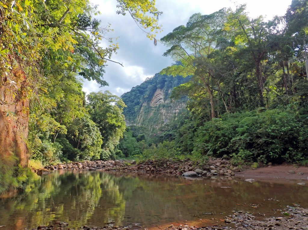 There were said to be small caves somewhere further up the river, but we had no idea of where they might be. These caves were said to contain both bats, and guácharos​ (Steatornis caripensis), also known as oilbirds. These strange creatures are large nocturnal frugivorous birds that live in caves and ecolocate like bats. The squabs are said to be so fat that you can put one on a stick and use it for a torch. I searched the banks carefully looking for a side trail but found nothing. Eventually Ann grew tired of walking on cobbles and decided to turn back.