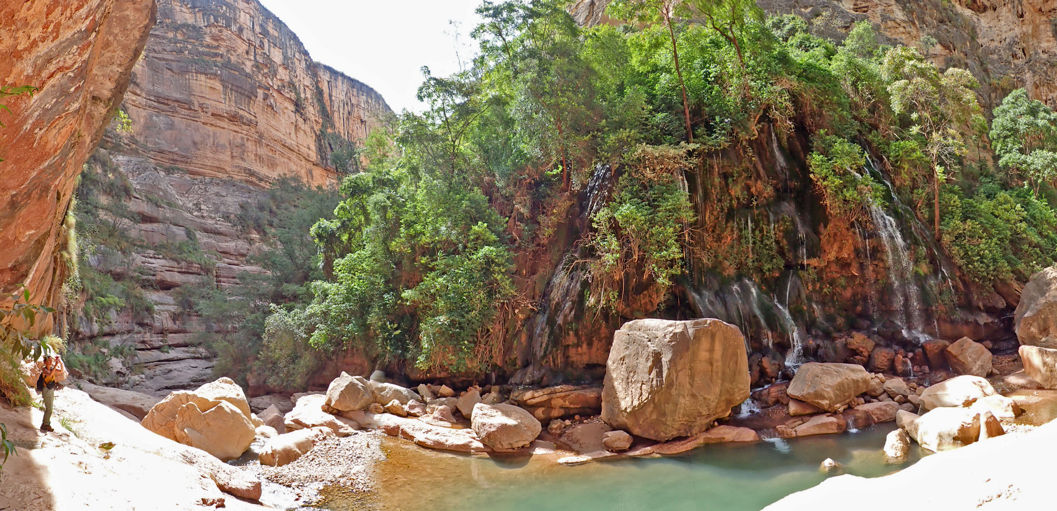 We eventually arrived at a travertine waterfall known as El Vergel which emerges from a narrow band of limestone part way up the canyon wall.