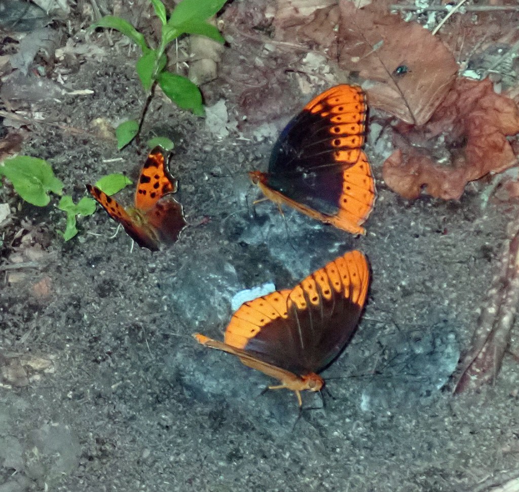 I was pleased to see an abundance of male Diana Fritillaries, Speyeria diana. This large beautiful species is sexually dimorphic, the males are burnt orange, whereas the females are dark blue. For some inexplicable reason the two sexes (Remember, there are only two sexes in any organism!) emerge at different times, and I saw no females. The larvae feed only on violets, but the adults love bear shit!