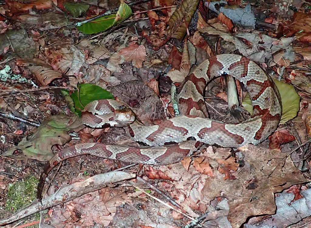 Watch your step! The Upper Bald River Wilderness has several stream crossings so we wore sandals. Ann often walks ahead of me. She had passed by several minutes earlier when I looked down to discover that I was about to step on a coppernipper! It was already alert, so she must have stepped within inches.
