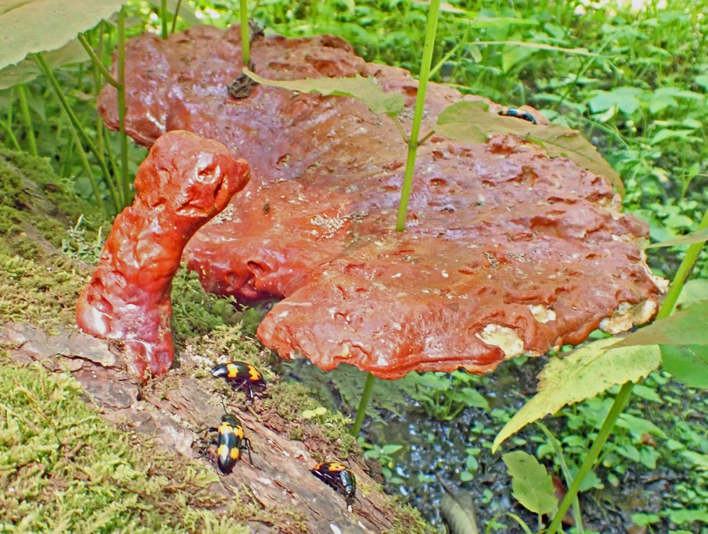 Another interesting insect was the Pleasing Fungus Beetle, Megalodacne fasciata. On several occasions I found them gathered on Ganoderma tsugae shelf fungus growing on dead hemlocks.