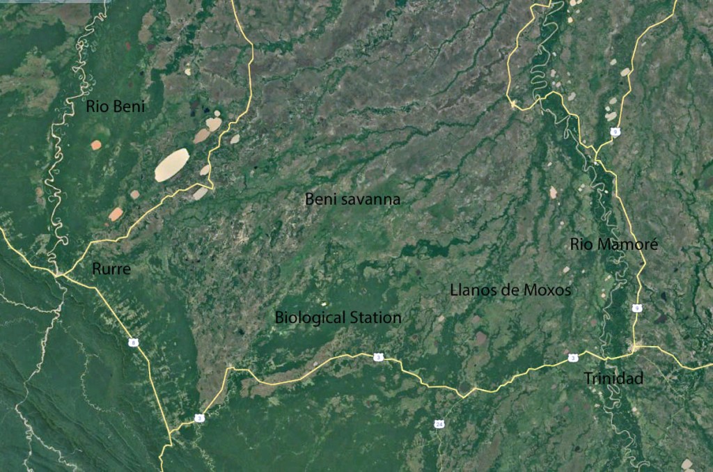 The Llanos de Moxos are generally inhospitable to human life. Soils are soggy. Flooding covers up to 60% of the land for up to 10 months; thereafter, everything bursts into flames. Just imagine the worst aspects of the Everglades and Texas combined, a great place to be a mosquito or a crocodilian, but a bad place to be either a person or a tree. Cattle ranching is the only viable occupation.
