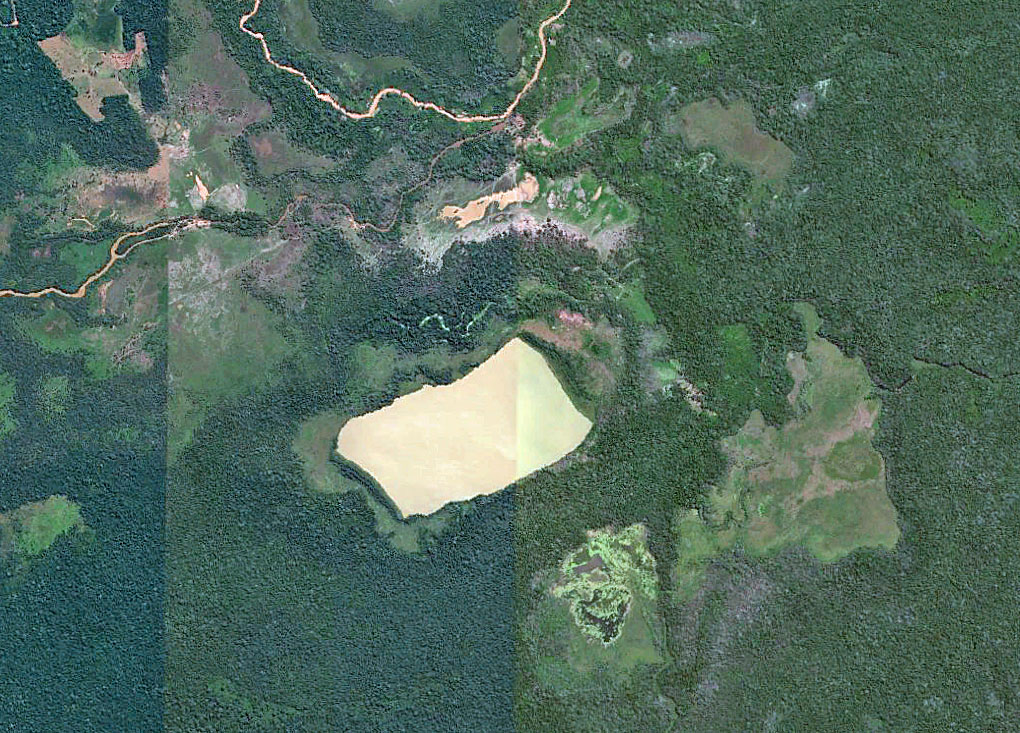 Most of the square ponds are in the savanna, but how about this one which is located in terra firma forest? I was certain that it had to be gold mining since there is a village immediately to the north, but I zoomed in. No sign of disturbance other than cattle.