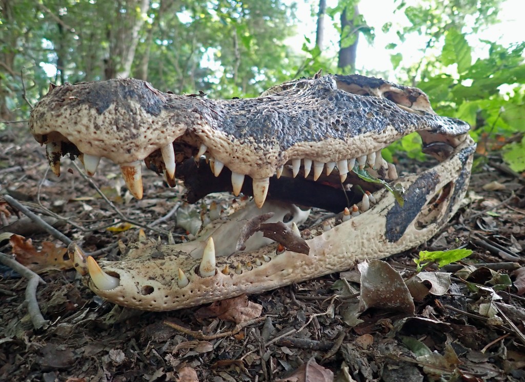 Thus far I had found no snakes, only a big snake skeleton. Suddenly Ann shouted, “Over here!” She had discovered a crocodilian graveyard. The trail we were on had been made by poachers, and the skulls of caimans were scattered about.