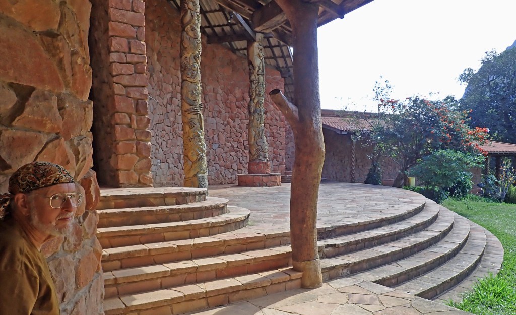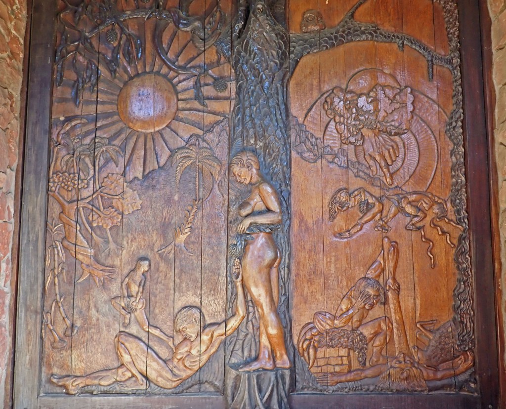 I was intrigued to see that the log spanning the pool featured not only the usual graffiti, but also fairly well executed carvings of squirrels, rabbits, parrots, doves, armadillos, and anthuriums. I had read that the missions of Chiquitania had a tradition of elaborate wooden carvings intended to convey biblical themes to illiterate campesinos. This was our first glimpse of wonders yet to come.