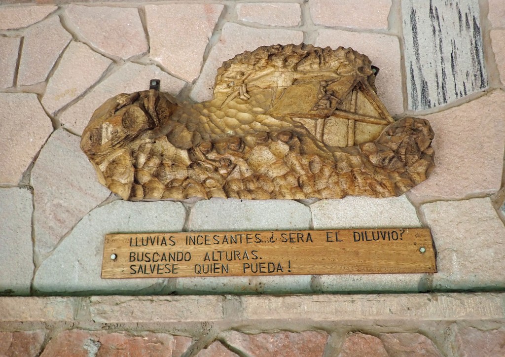 In the first panel the skies are represented by God’s water jugs, all of which are emptying into the Velo de la Novia, the beautiful little waterfall I had visited the day before. On the right the train hurries toward its rendezvous with disaster. It enters the flood but never emerges. On the left the hapless victims rush toward Chochis, but to no avail. (I have omitted several of the panels.)