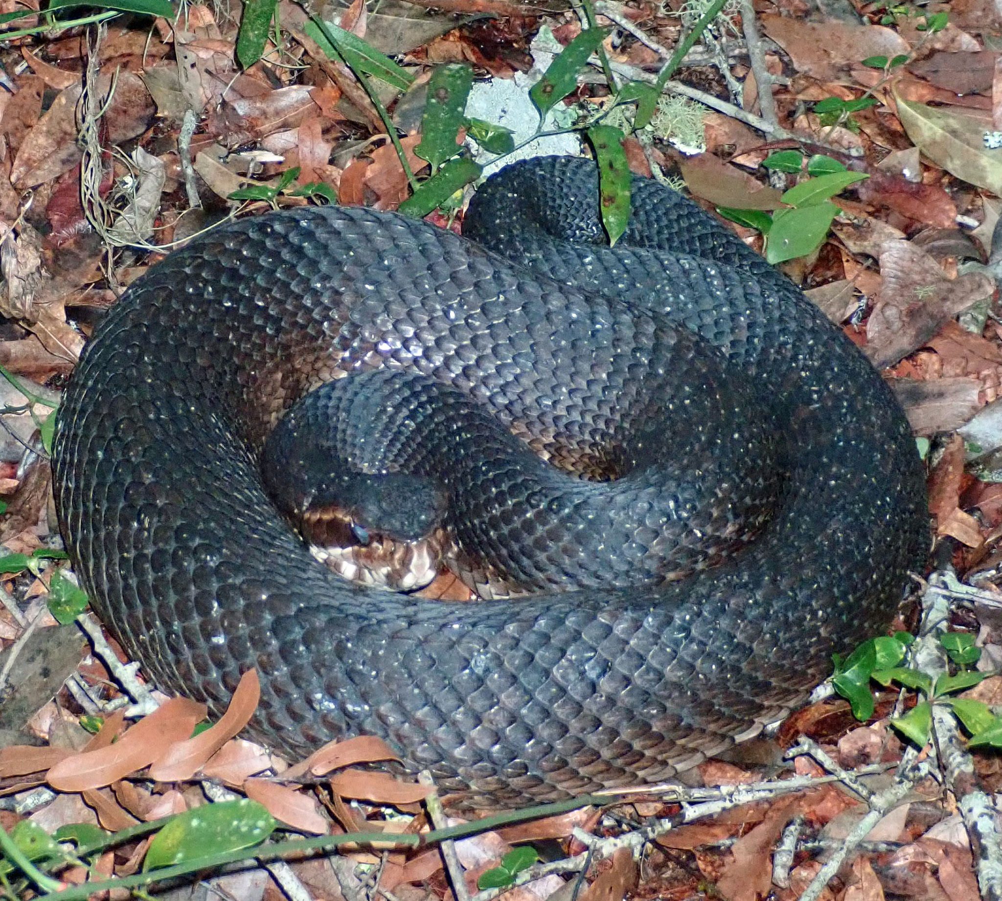 This was the second time I have found this fine fat fellow in my front yard. Both times he thrashed about to let me know he was there, then slowly crawled a short distance away to coil up and contemplate being King of the Swamp.