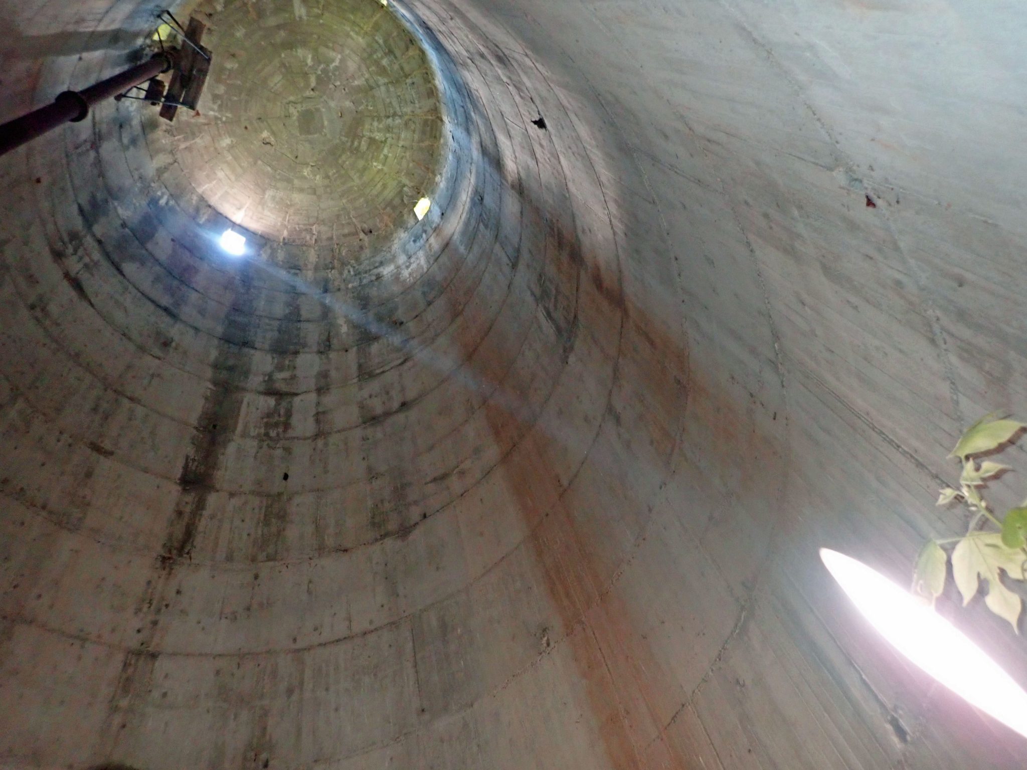 Some arduous bushwhacking led me to the great silo, or whatever the heck it was? It couldn’t possibly have held water. If it was grain how did they fill and empty it? There was a small door at the bottom, and the vertical pipe seen here, but no other infrastructure. Will some geometrician please explain to me how a rectangular window can cast an elliptical sunbeam?