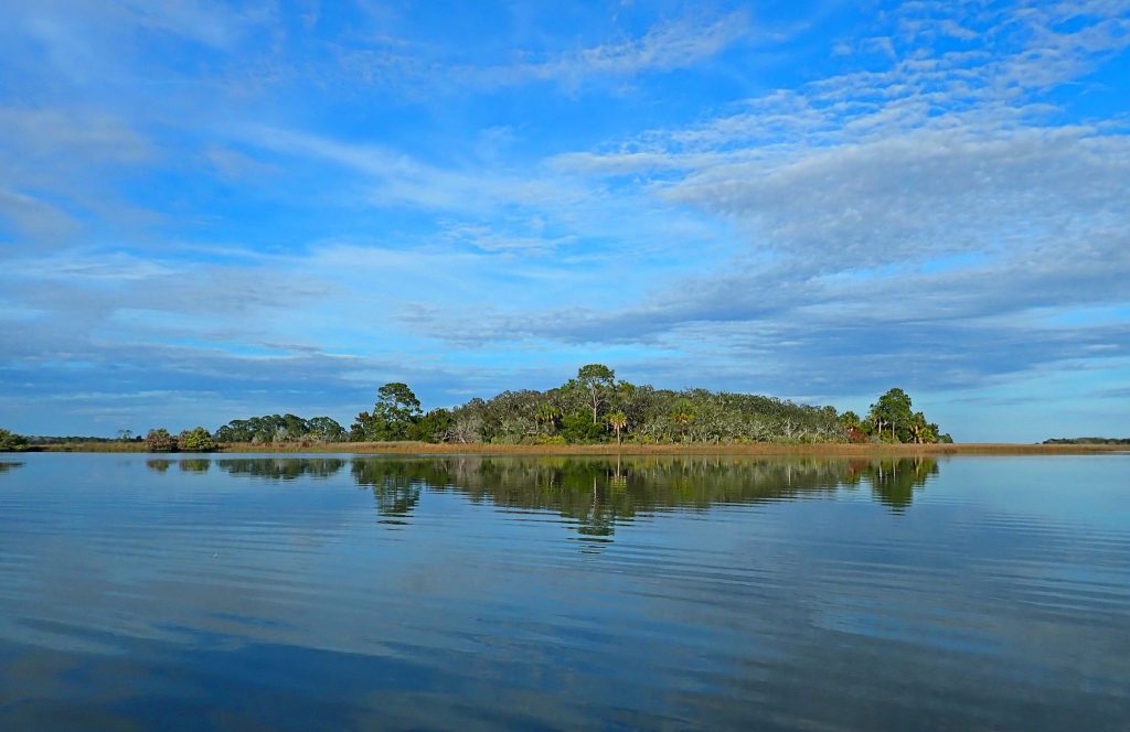 But this day was different. The previous low tide had been exceptionally high, and the high tide at sunset was predicted to be exceptionally low. This minimal tidal differential meant that the water was barely moving, a most unusual phenomenon in a place where the tides otherwise rush ceaselessly to and fro. The mud flats and oyster bars were completely covered so there was no problem paddling anywhere I might wish to go.